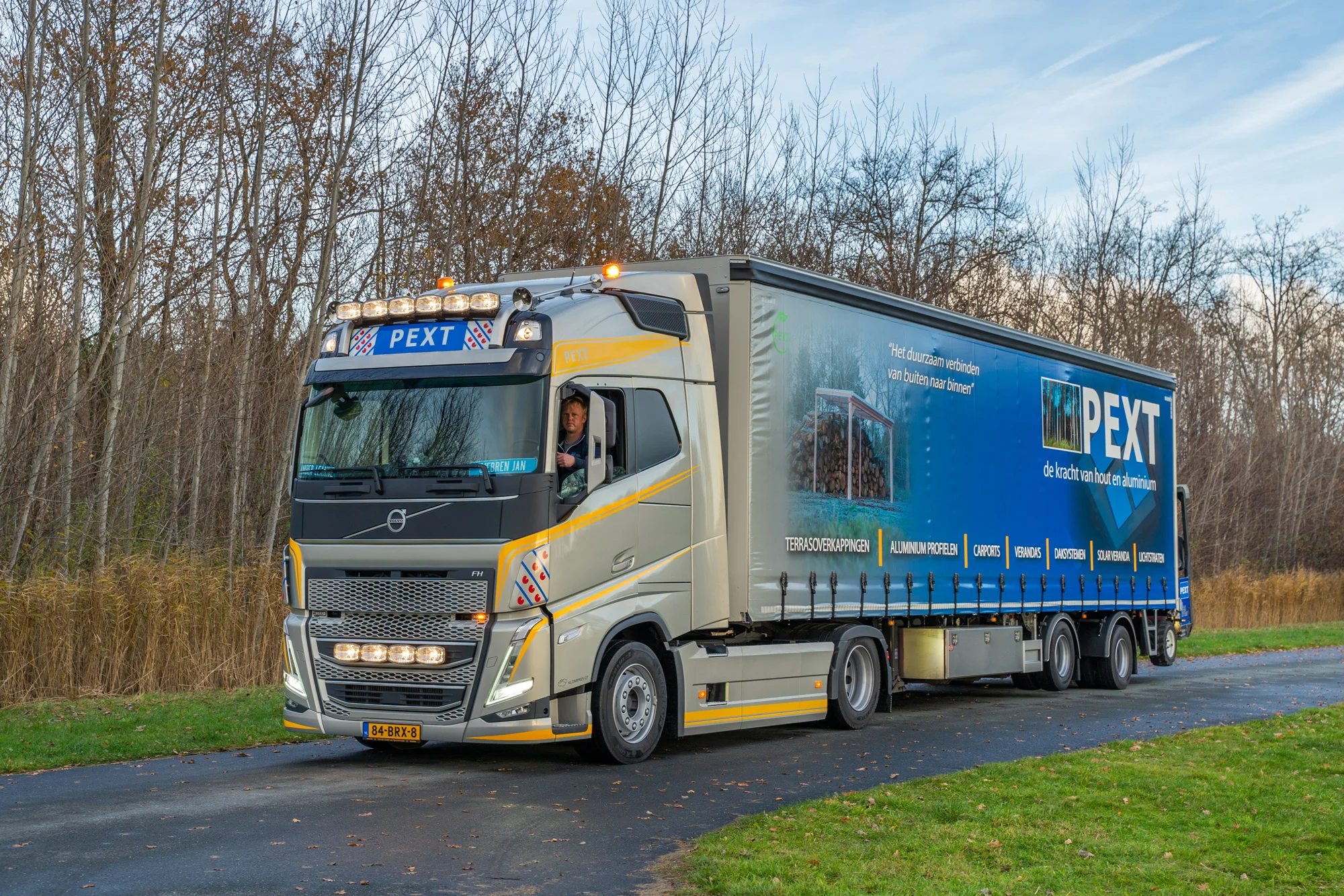 In het gesprek met Theo komt duidelijk naar voren dat zij goed weten wat ze nodig hebben en wat ze moeten doen om hun klanten naar tevredenheid van dienst kunnen zijn. Het unieke karakter dat erbij komt kijken wanneer je productie voornamelijk uit maatwerk bestaat, maakt eigen vervoer voor Pext een logische keuze. Daarmee is het maatwerk in het hele proces van de productie van overkappingen, lichtstraten en veranda’s tot en met de distributie terug te zien.