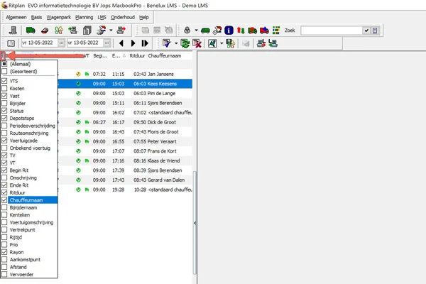 In de uiterste linkerbovenhoek bij het rittenoverzicht zit een klein knopje. Wanneer erop geklikt wordt, verschijnt een lijst met informatie over de ritten die aan of uit te zetten is. Zo kan er een TV (tijdvenster) aan de lijst worden toegevoegd. Hierdoor verschijnt in het overzicht een klokje wanneer één of meer orders een tijdvenster hebben. Is het klokje rood, dan is er minstens één tijdvenster dat wordt overschreden. Is het oranje, dan is er tenminste één klant waarbij het tijdvenster wordt overschreden, maar nog binnen de ingestelde overschrijdingstolerantie. Is het klokje groen, dan worden alle tijdafspraken in de rit gehaald.